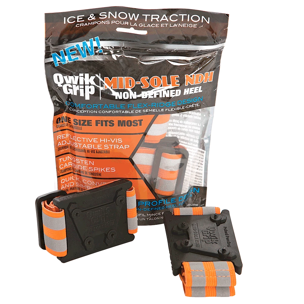 WARNING: Due North Qwik Grip Mid-Sole DH may generally help give you traction on ice, snow or other porous surfaces that you may encounter on a day-to-day basis. NO product can completely prevent a slip or fall on unsafe surfaces that may be slippery, greasy or unstable. This Qwik Grip Mid-Sole may only help with traction if worn on proper footwear that has a 90 degree defined heel and if placed properly as shown on the user guide. The Due North Qwik Grip Mid-Sole only provides traction for the user if the user’s foot is firmly placed on the surface during stepping in a flat position. Do not wear with high heels, slippers or any other type of shoe that does not have a solid bottom or top. Qwik Grip Mid-Sole aids are not meant to be worn on slick surfaces such as granite or marble, or on ladders or similar equipment or when driving a vehicle. Use care as Qwik Grip Mid-Soles are sharp and may injure or damage flooring, surfaces or skin. Qwik Grip Mid-Soles are not meant to be used for athletic activities such as mountaineering, hiking or running, nor on steep up or down slopes. This product contains latex.
