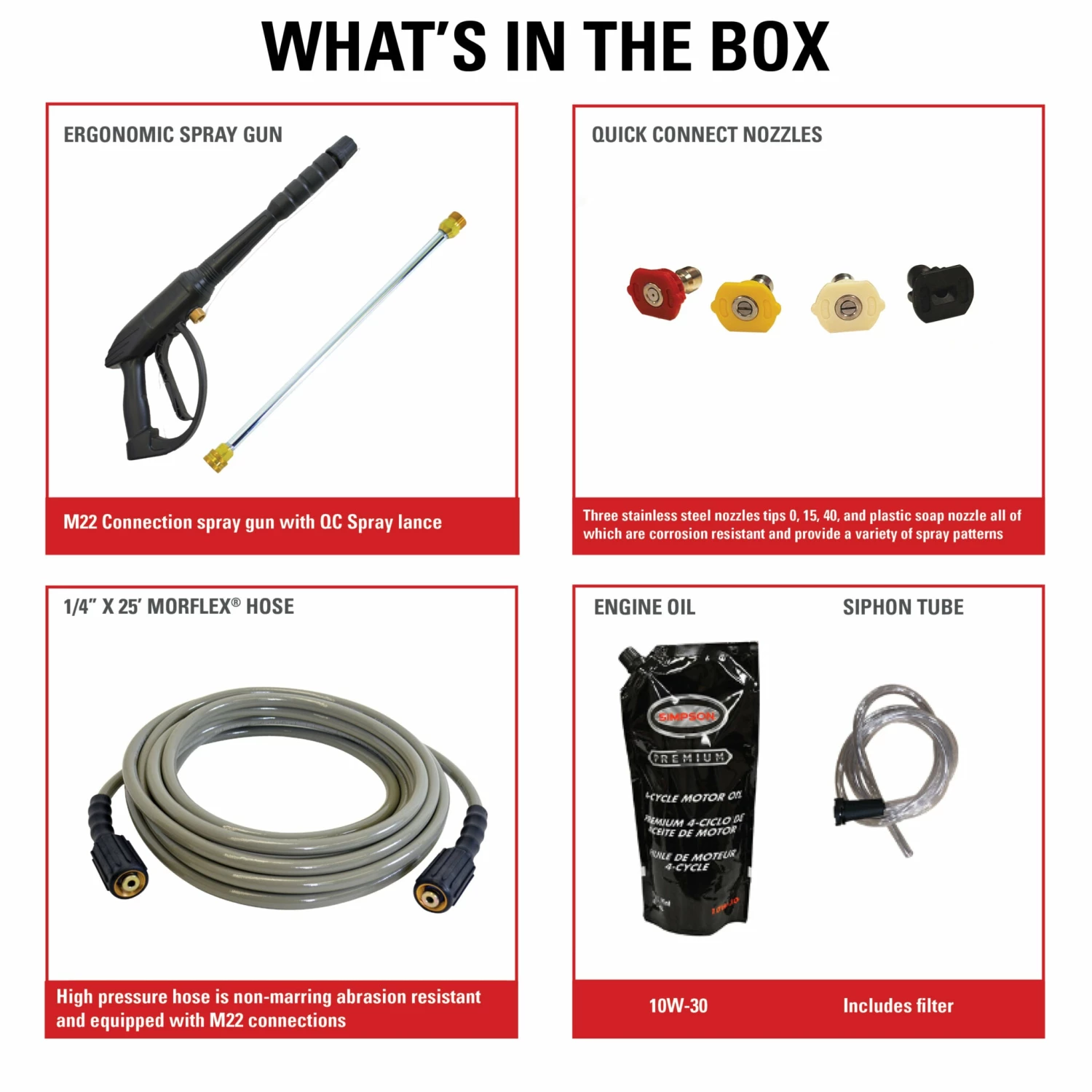 - 4 Quick connect nozzle tips: 0°, 15°, 40° and soap to use for a variety of cleaning applications