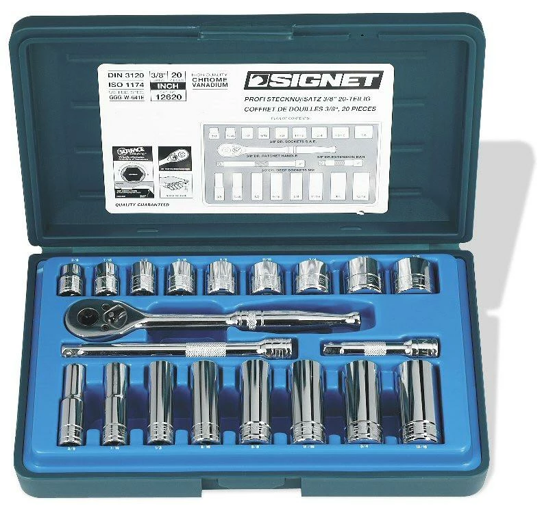 Signet 3/8″ Drive 20 Piece SAE Socket Set is contained within a quality, durable blow molded case. Surface Driveâ„¢ configuration virtually eliminates the rounding of fasteners. Ratchets have a locking/quick release button, which will hold the socket firmly until the locking/quick release button is again pressed to ensure no more dropped sockets. Ratchets have a 45 teeth count.