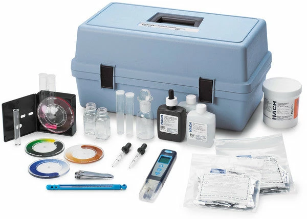 Hach 2559800 Surface Water Test Kit can test for ammonia, chlorine, pH, dissolved oxygen, phosphorus, and temperature. This kit includes ten reagents, deionized water, color discs, thermometer, tubes, Pocket Pro pH tester, clippers, dropper, measuring tube, bottle, BOD bottle, color comparator box, viewing adapter, instruction sheet, and carrying case.