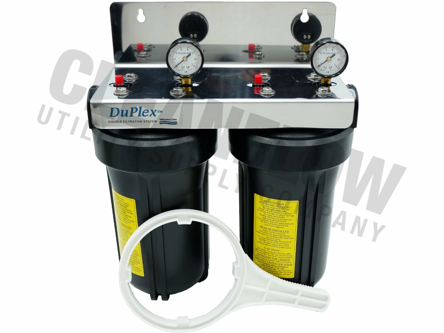 Waterite DuPlex Big Blue 4.5″ Diameter Water Filter Housing Kits accept two 10″ long Big Blue 4.5″ diameter filters. These double filter kits can be used to filter sediment and odors out of the water supply for smaller systems including homes, campgrounds and process treatment.